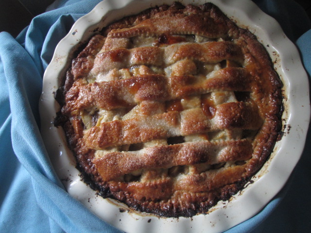 Roll out the remaining dough between sheets of parchment paper. Cut the dough in 12 strips. To weave the lattice place the strips next each others on top of the pie, leaving about a 1 inch gap between strips.